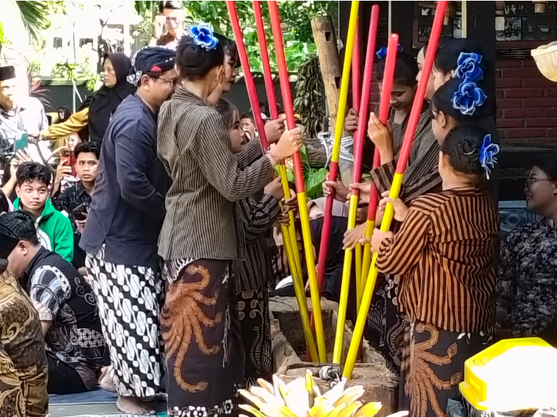 monwnews.com – Malang,- Ini musik lesung atau kotekan lesung, Tradisi Jawa yang lahir dari dapur, tapi maknanya nembus sampai ke balai desa. Di foto ini kelihatan jelas: ibu-ibu & mbak-mbak berkebaya lurik, alu merah-kuning dihentakkan bareng ke lesung, ditonton warga.