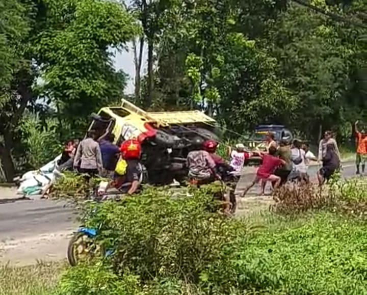 “Truk itu mau nyalip kendaraan di depannya. Baru dapat separuh, tiba-tiba roda belakang kanan nyiset (red, bermasalah). Akhirnya munting lalu terguling itu,” kata Kurniawan.