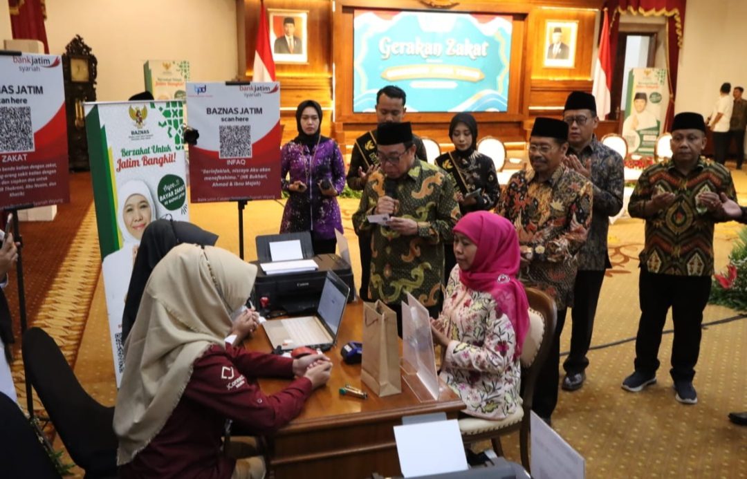 Gubernur Jawa Timur, Khofifah Indar Parawansa melakukan "Gerakan Zakat Bersama" dengan ditandai penyerahan zakat kepada Badan Amil Zakat Nasional (Baznas) Jatim, di Gedung Negara Grahadi, Minggu(26/3/2023) (foto: kominfo jatim)