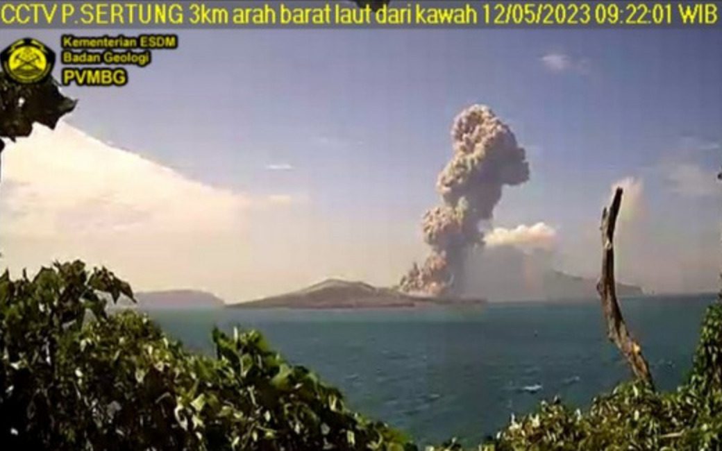“Terjadi erupsi Gunung Anak Krakatau pada hari Jumat, 12 Mei 2023, pukul 09:20 WIB. Tinggi kolom letusan teramati ± 2500 m di atas puncak (± 2657 m di atas permukaan laut). Kolom abu teramati berwarna kelabu dengan intensitas tebal ke arah barat daya. Erupsi terekam di seismograf dengan amplitudo maksimum 70 mm dan durasi 42 detik”, jelas Pusat Vulkanologi dan Mitigasi Bencana Geologi (PVMBG) Kementerian ESDM