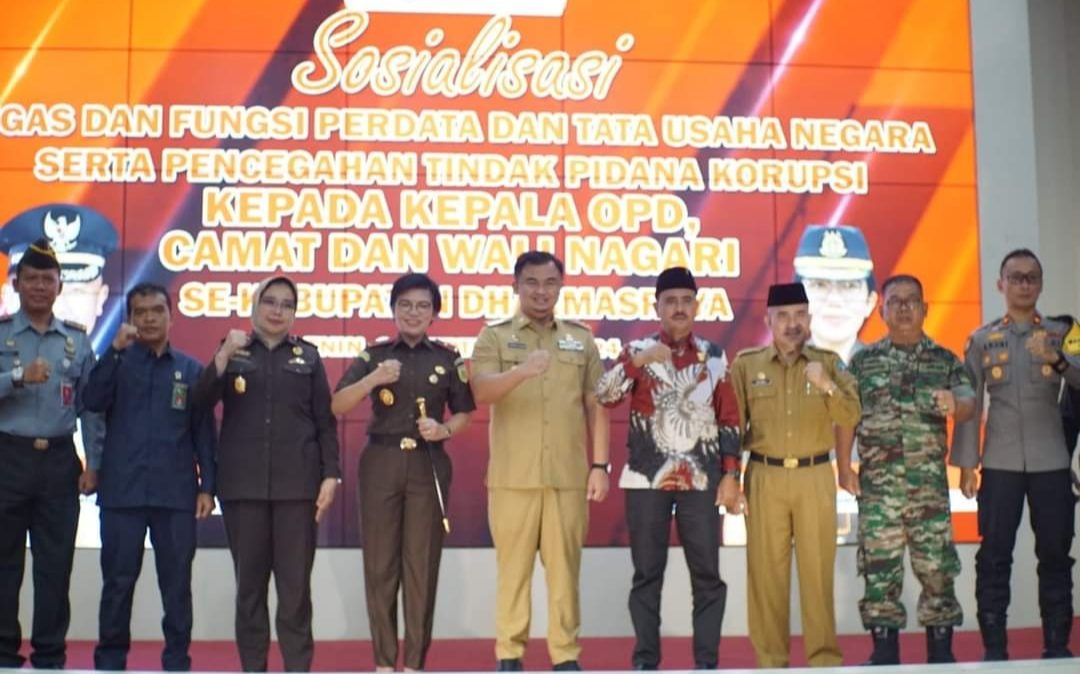 Kunjungan kerja Kajati Sumbar di Kabupaten Dharmasraya, dilaksanakan Sosialisasi Tugas Pokok dan Fungsi Perdata dan Tata Usaha Negara, dan Pencegahan Tindak Pidana Korupsi kepada Kepala Perangkat Daerah, Camat dan Walinagari.
