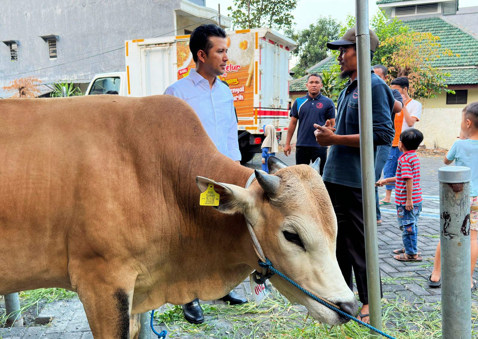“Alhamdulillah sapinya sudah tiba di lokasi yang telah dipilih. Sapi ini berusia tiga tahun dan punya berat kurang lebih 570 kilogram,” ujar Ansori, pemilik sapi yang dibeli Wagub Emil dari Kangean.