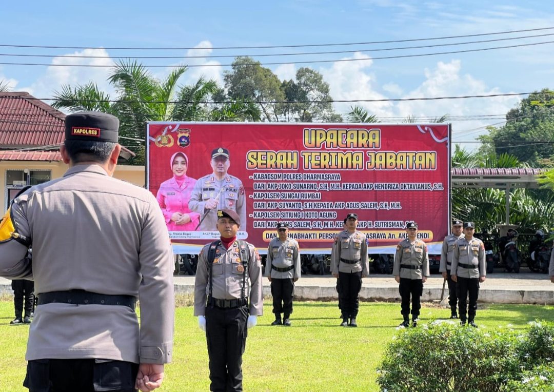 Dalam rangkaian upacara ini, para pejabat baru dilantik dan diambil sumpahnya oleh Kapolres Dharmasraya sesuai dengan agama Islam. Proses serah terima jabatan dilanjutkan dengan penandatanganan surat perintah yang baru. Sementara itu, AKP Efendi, yang memasuki masa purna bhakti, dianugerahi penghargaan dan medali sebagai wujud apresiasi atas pengabdiannya yang panjang dalam Kepolisian Republik Indonesia.