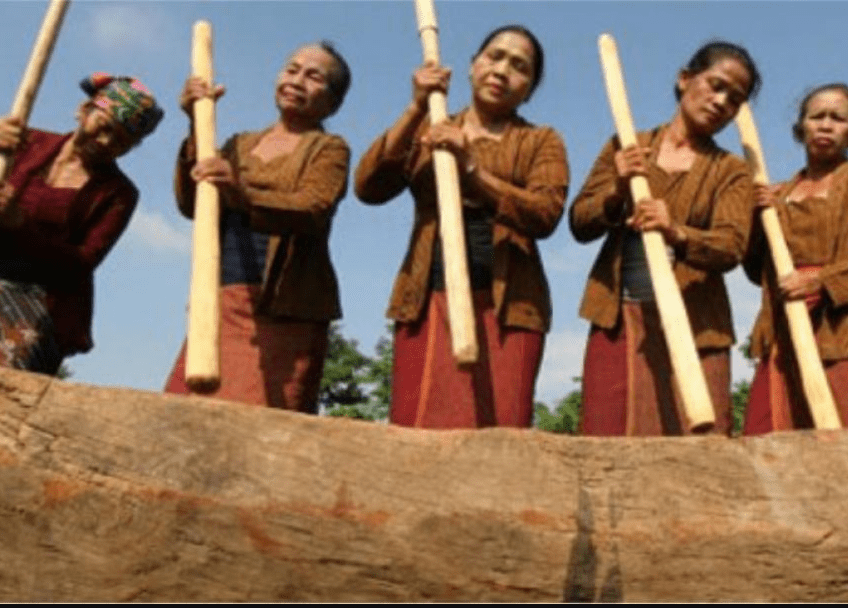 irama ritmis Musikal Kotekan Lesung lahir dari kerja kolektif ibu-ibu petani menumbuk padi pasca-panen, mengubah rutinitas melelahkan menjadi pesta musik yang melambangkan harmoni sosial dan syukur bersama.