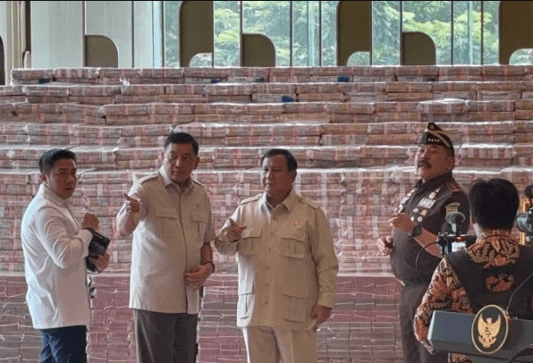 Presiden Prabowo sempat berdiri di depan tumpukan uang yang merupakan hasil korupsi crude palm oil (CPO) dan turunannya.