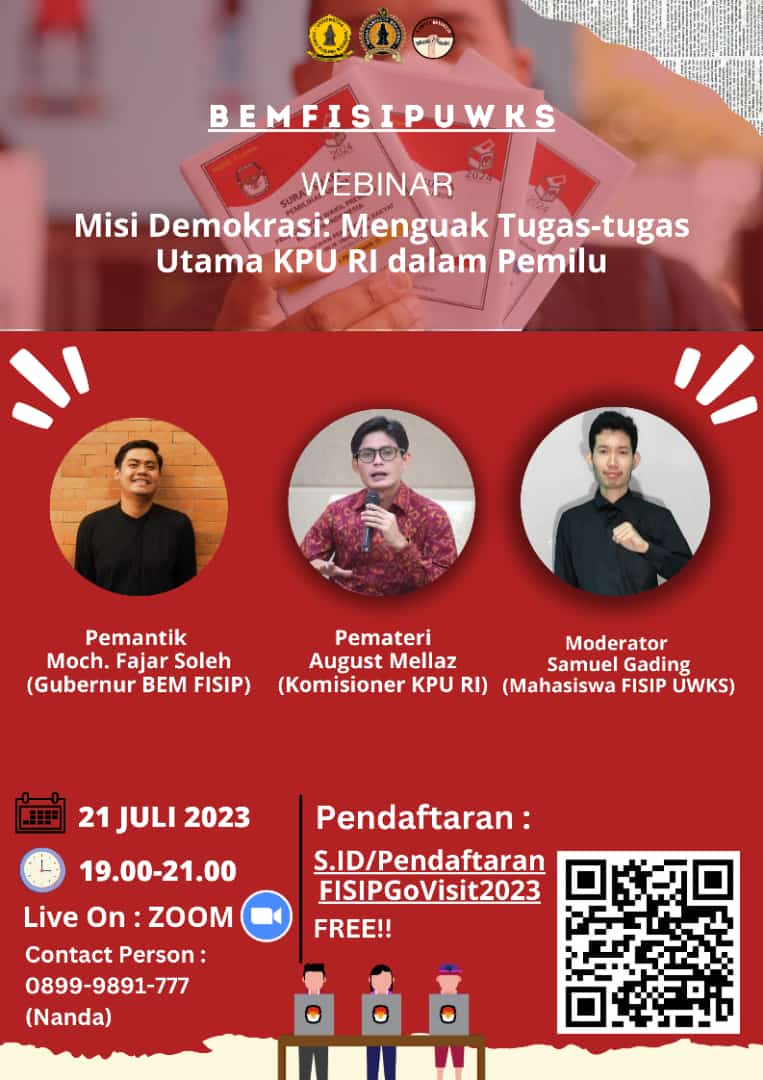 Agenda tersebut merupakan kerja sama BEM FISIP UWKS dengan Komisi Pemilihan Umum Republik Indonesia (KPU RI). Nantinya Anggota KPU RI August Mellaz, akan hadir sebagai narasumber.