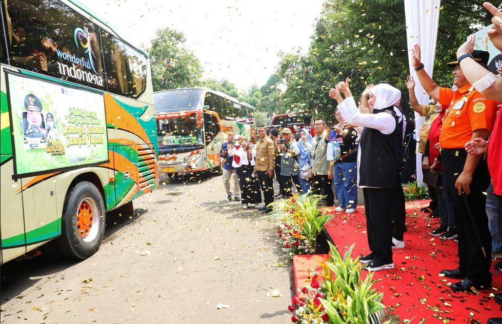 Gubernur Jawa Timur Khofifah Indar Parawansa secara khusus memberangkatkan 24 bus rombongan program mudik Jakarta-Jatim dari Halaman Padepokan Pencak Silat Taman Mini Indonesia, Jakarta, Selasa (18/4/2023) pagi.