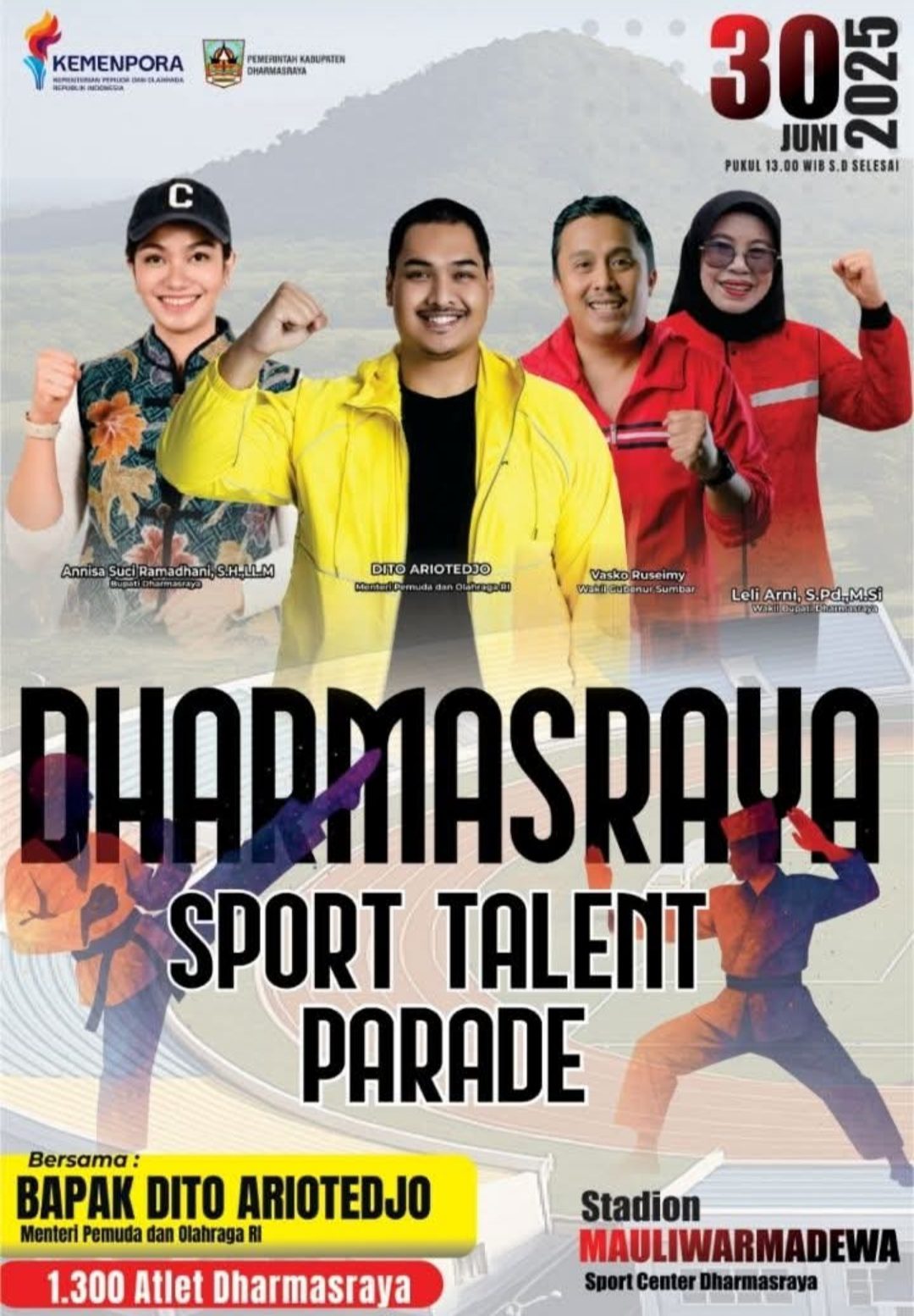 Monwnews.com, Dharmasraya – Menteri Pemuda dan Olahraga Republik Indonesia (Menpora RI) Dito Ariotedjo dijadwalkan melakukan kunjungan kerja ke Kabupaten Dharmasraya, Senin (30/06/2025), dalam rangka menyaksikan langsung Parade Talenta Atlet Dharmasraya yang digelar di GOR Mauliwarmadewa Sport Center, Koto Padang, Kecamatan Koto Baru.