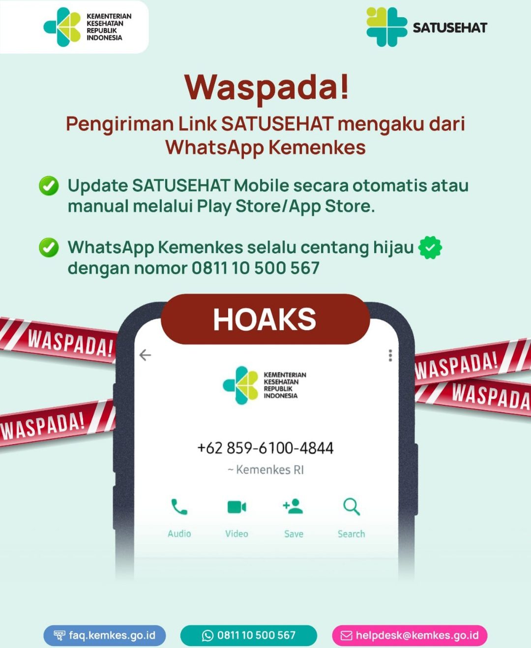 MonWnews.com, Jakarta – Kementerian Kesehatan (Kemenkes) RI baru – baru ini terima laporan penipuan lewat nomor WhatsApp berisi link update SATUSEHAT Mobile. Nomor WhatsApp tersebut mengatasnamakan Kemenkes.