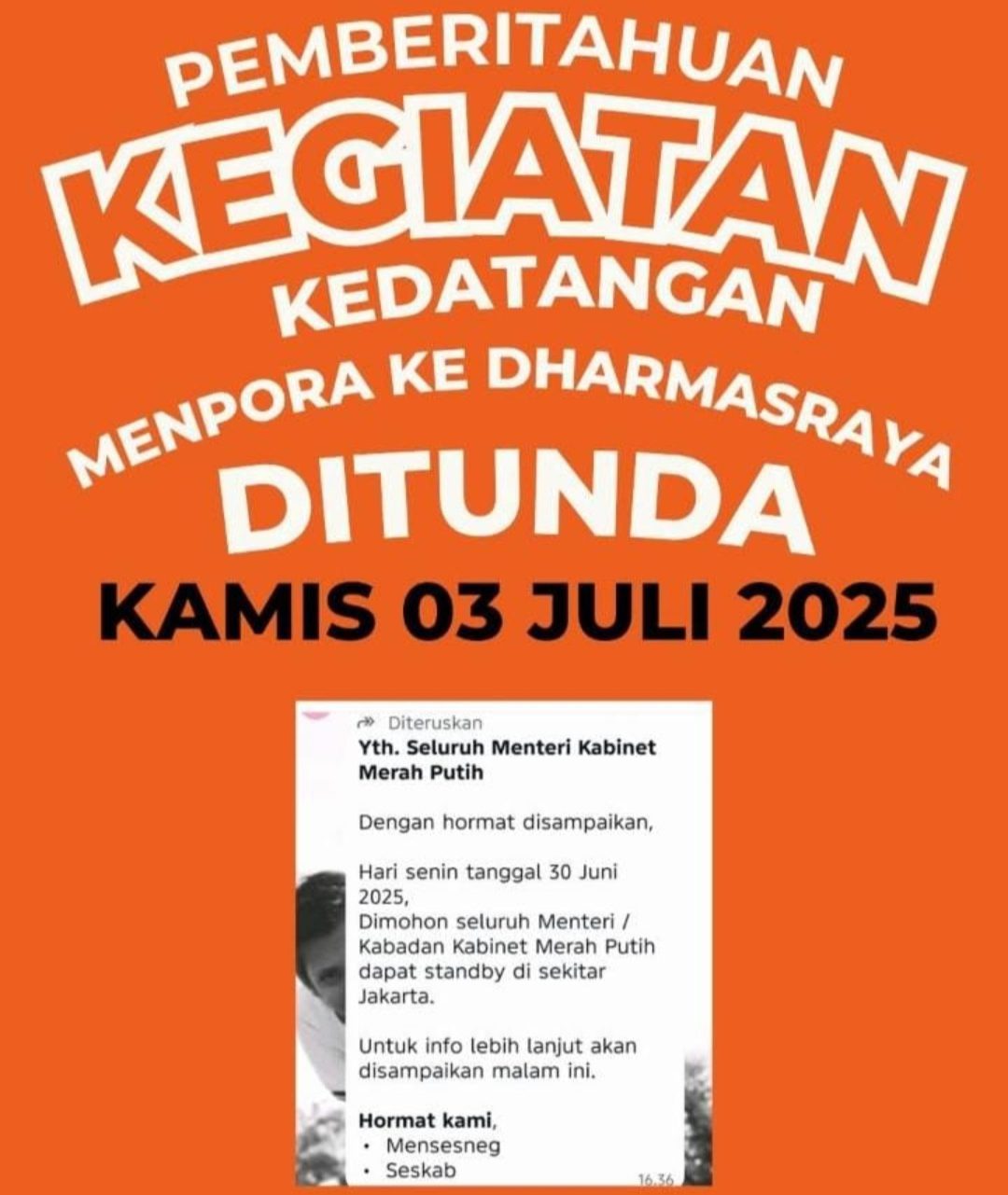 “Kami menerima pemberitahuan resmi dari Protokol Kemenpora bahwa jadwal kunjungan Pak Menteri harus disesuaikan karena instruksi Setneg dan Seskab. Namun, Alhamdulillah telah disepakati bahwa kegiatan akan digelar pada Kamis, 3 Juli 2025,” jelas Bobby.