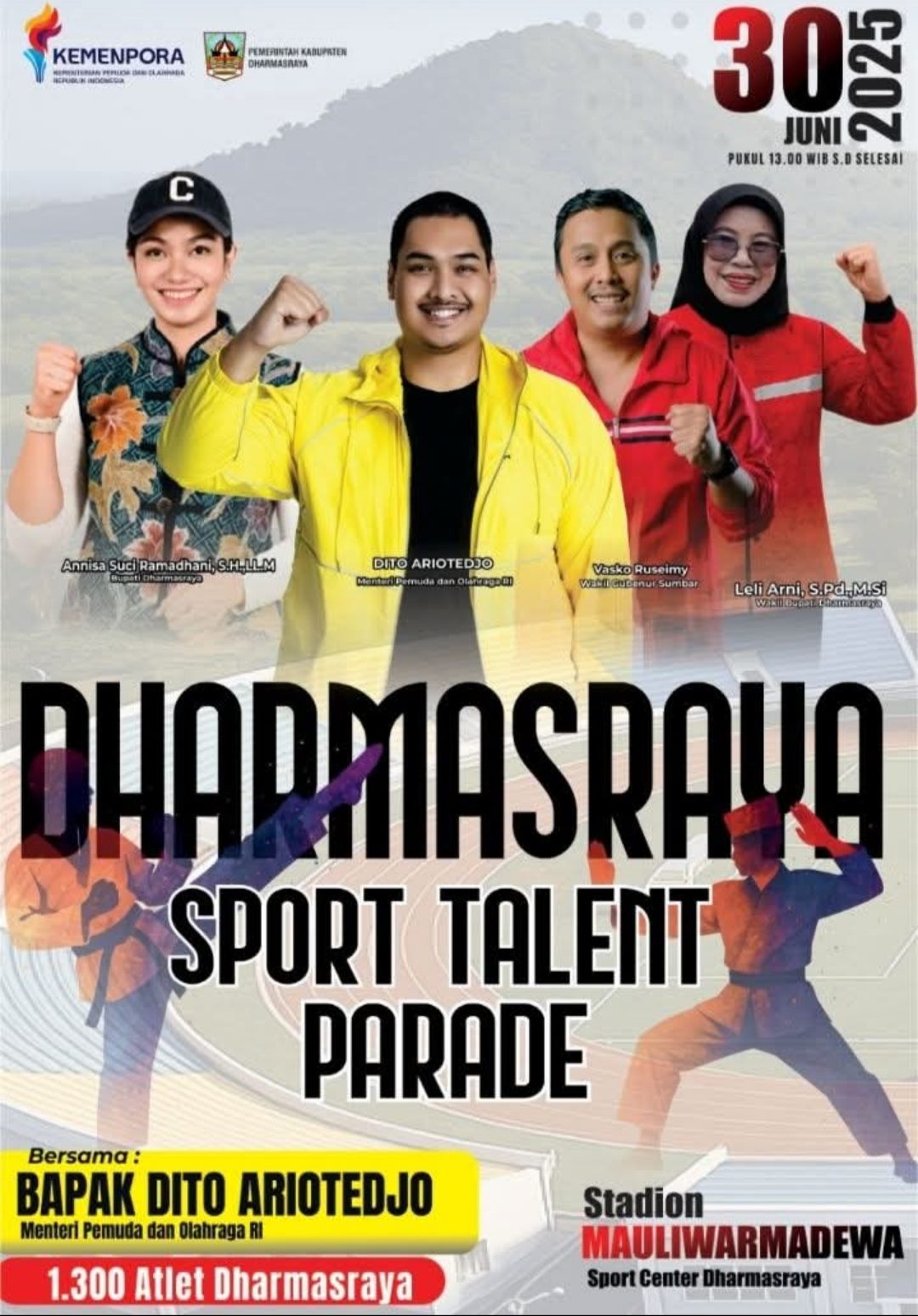 Famlet Kegiatan Parade Talenta Atlet Dharmasraya yang semula dijadwalkan pada Senin, 30 Juni 2025, dijadwal ulang dilaksanakan pada Kamis, 3 Juli 2025, di GOR Mauliwarmadewa Sport Center.