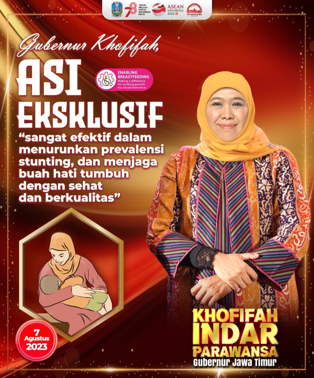 “Meski hari ini hari terakhir Pekan Menyusui Sedunia 2023, tapi hari ini merupakan hari memulai melakukan gerakan bersama secara masif memberi semangat para ibu untuk memberikan ASI Ekslusif. Termasuk para ibu yang juga aktif bekerja, harus punya komitmen untuk memberikan ASI Eksklusif,” ujar Gubernur Khofifah, Senin (7/8/2023).