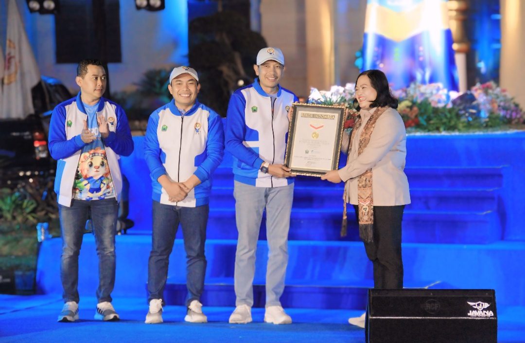 Secara simbolis, piagam rekor diserahkan pihak MURI kepada Walikota Malang; Dr Ir Wahyu Hidayat, MM didampingi Wakil Walikota Ali Muthohirin dan Direktur Utama Perumda Tugu Tirta; Priyo Sudibyo, SE, S.Sos, MM, saat prosesi kirab obor Porprov di halaman Balaikota Malang, Jumat (27/6/25) malam.