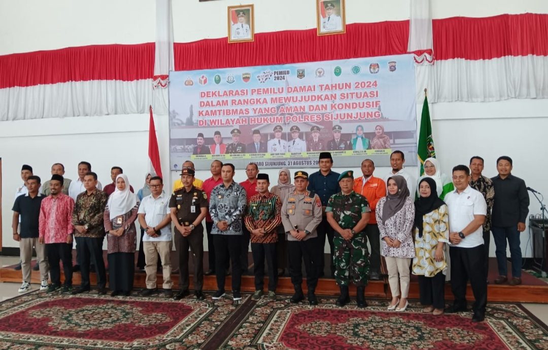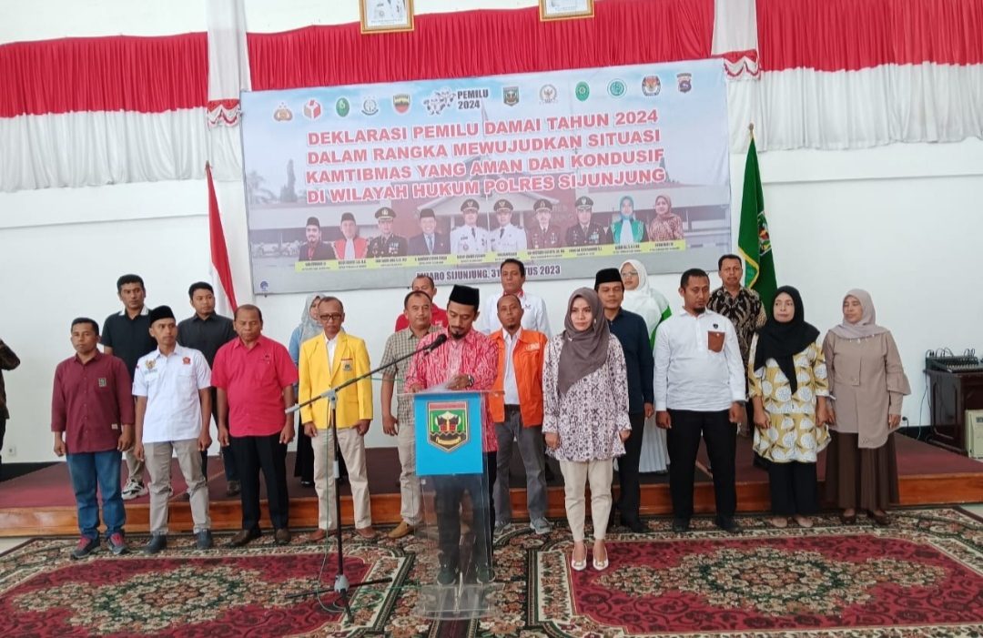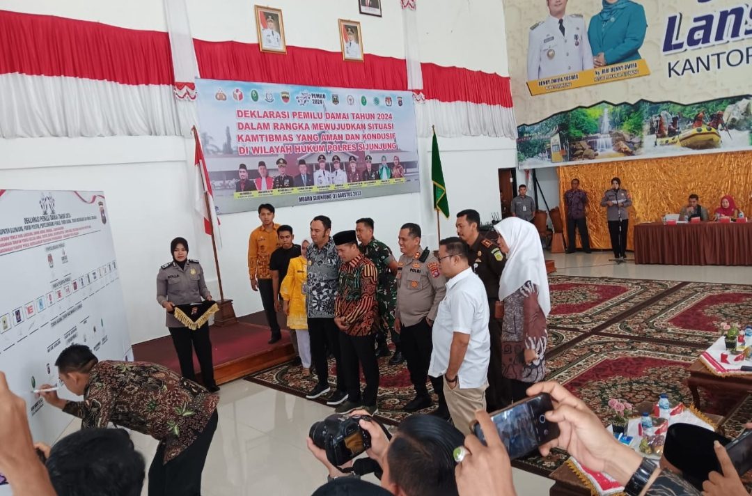 MonWnews.com, Sijunjung – Polres Sijunjung Polda Sumbar Gelar Acara Deklarasi Pemilu damai Tema “Mewujudkan situasi yang aman dan kondusif di wilayah hukum Polres Sijunjung.” dilakasanakan di Balai Irung Lansek Manih Kantor Bupati Sijunjung Sumatera Barat Kamis (30/08/2023)