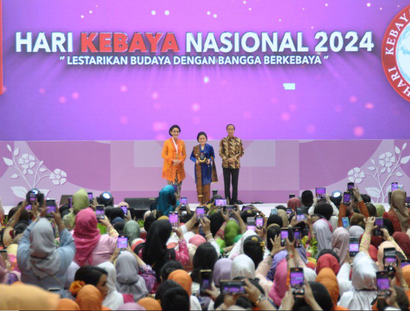 Monwnews.com, Presiden RI Joko Widodo (Jokowi) dan Ibu Iriana menghadiri Peringatan Hari Kebaya Nasional yang diselenggarkan di Istora Senayan Gelora Bung Karno, Jakarta, Rabu (24/07/2024) pagi. Peringatan Hari Kebaya Nasional untuk pertama kalinya diperingati tahun ini mengangkat tema “Lestarikan Budaya Dengan Bangga Berkebaya”.