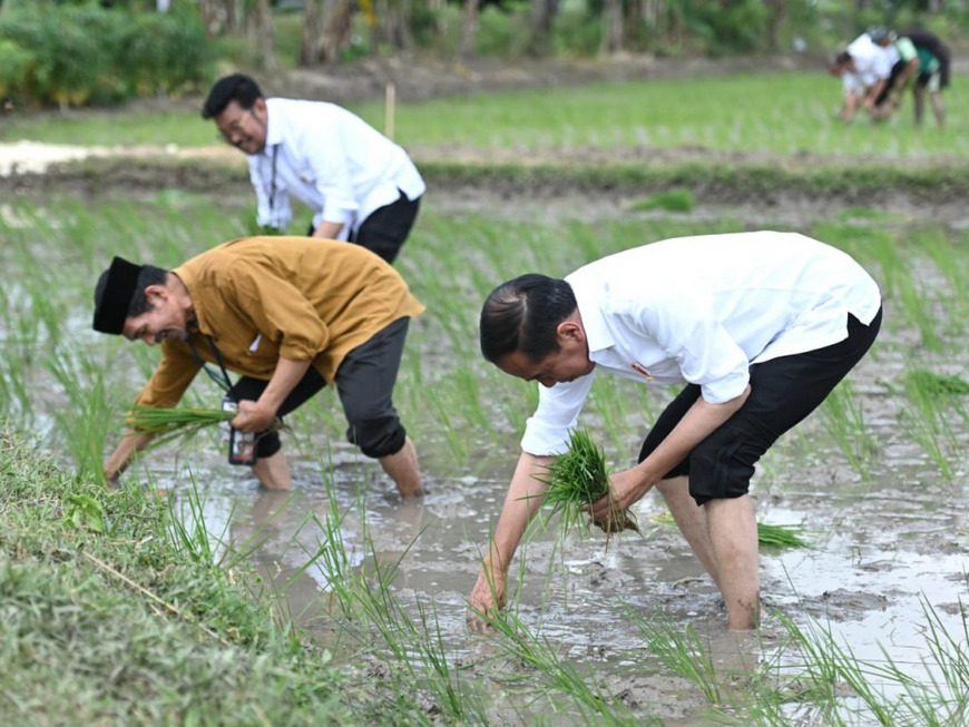 Monwnews.com, Tuban – Dalam kunjungan kerja (kunker) di Jawa Timur, Presiden RI Joko Widodo (Jokowi) didampingi Ibu Iriana Jokowi melakukan tanam padi bersama para petani di di Kawasan Daulat Pangan Serikat Petani Indonesia, di Desa Senori, Kecamatan Merakurak, Kabupaten Tuban, Kamis (06/04/2023) pagi. Presiden mengapresiasi para petani yang telah menggunakan pupuk organik untuk menggarap lahan seluas 1.000 hektare di kawasan tersebut.