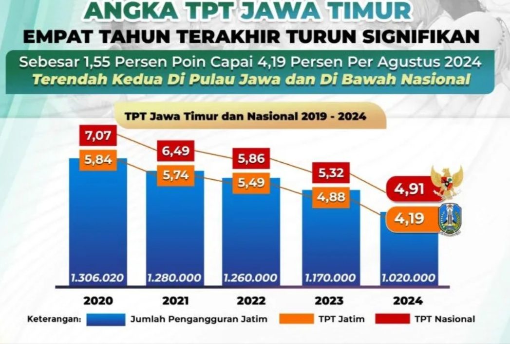 Berdasarkan data Badan Pusat Statistik (BPS) yang rilis 5 November 2024, pengangguran terbuka Jawa Timur pada Agustus 2024 berada di angka 4,19 persen atau 1,02 juta dan turun 0,69 persen poin dibandingkan Agustus 2023 yaitu 4,88 persen atau 1,17 juta.