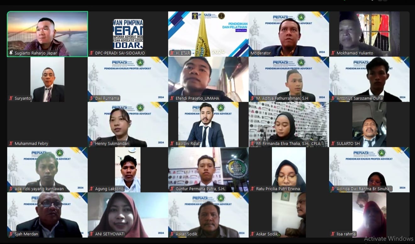 Sidoarjo – Dewan Pimpinan Cabang (DPC) Peradi SAI (Suara Advokat Indonesia) Sidoarjo Raya dibawah kepemimpinan H. Edy Rudyanto Tarigan mengukir sejarah menggelar PKPA (Pendidikan Khusus Profesi Advokat) perdana secara zoom meeting, Sabtu (24/8/2024), sejak pukul 08.00 WIB.